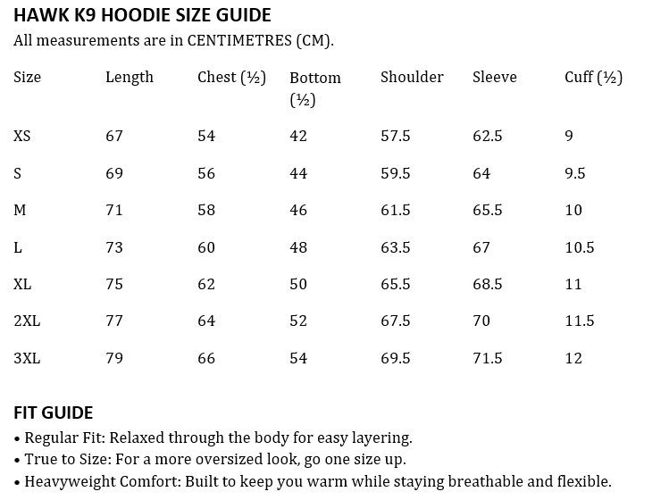 Embrace the spirit of Hawk K9 wherever you go, with a hoodie that’s as resilient and versatile as you are.Kieron in the photo is wearing a size Large. which sits baggy.